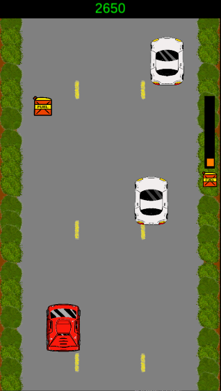 The Street Scurry game was designed as a fast-paced racing game where the objective is to achieve the highest score possible during the play session. There is a red sports car that the player can control left and right while dodging white drone cars that are also traveling on the road. As time moves forward there is an increment of 100 points added to the player score, but there is also a fuel drain of 1% for each second of time. Capturing a fuel canister in the road replenishes 10% of the fuel tank and adds a bonus of 250 points. These constraints add motivation for the player to gather fuel canisters to continue traveling as well as to incentivize additional fuel capture for extra points. Drone cars can also collide with each other which makes for a fun challenge since pileups can occur randomly and potentially cause the player to crash. Obtaining a high score is both a matter of the player's skill as well as being lucky enough to not get cornered in a car pileup.